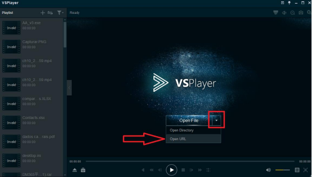 No nosso caso iremos utilizar o VSPlayer, clique em “Open File” e “Open URL” para adicionar um endereço.